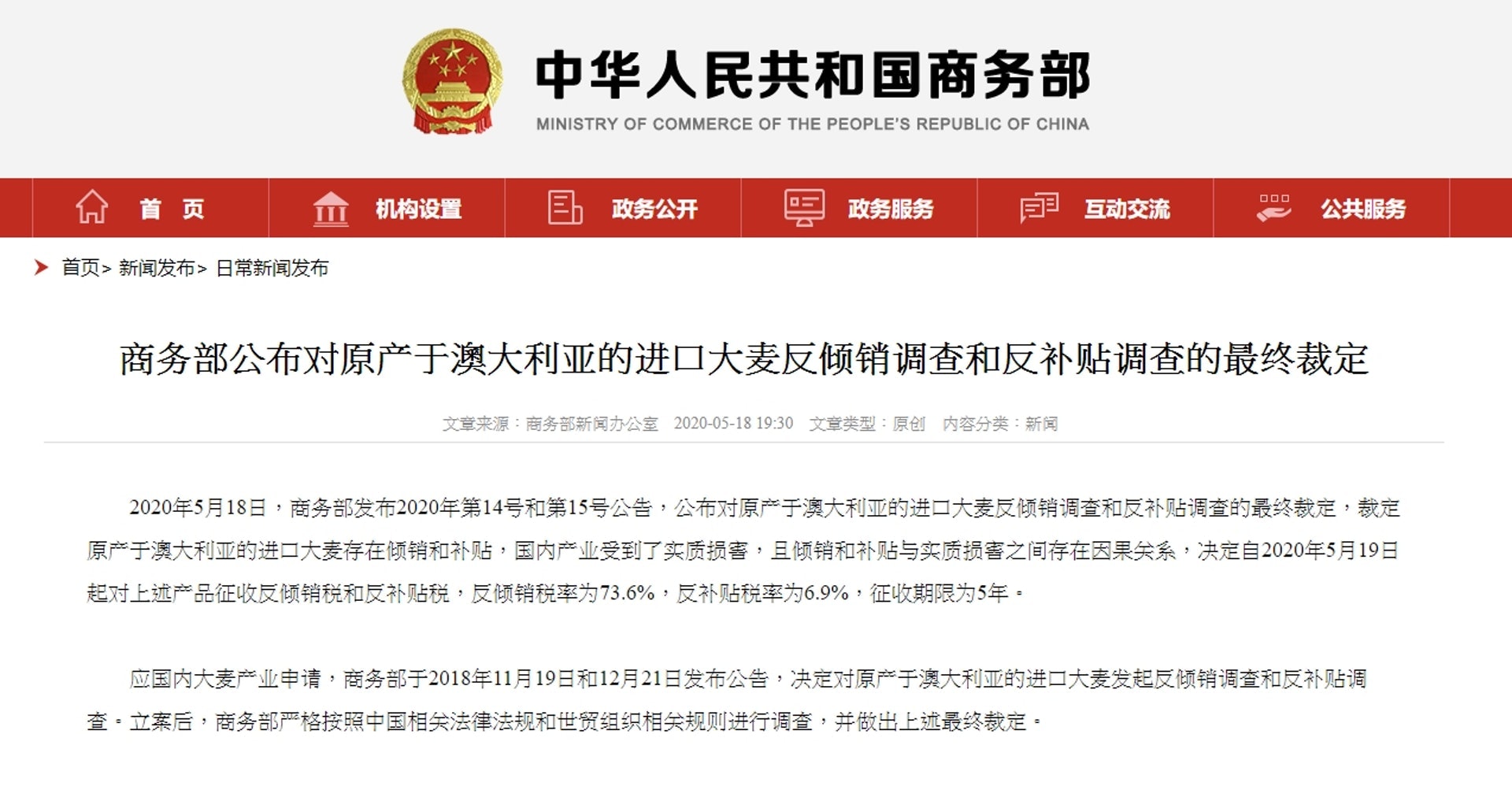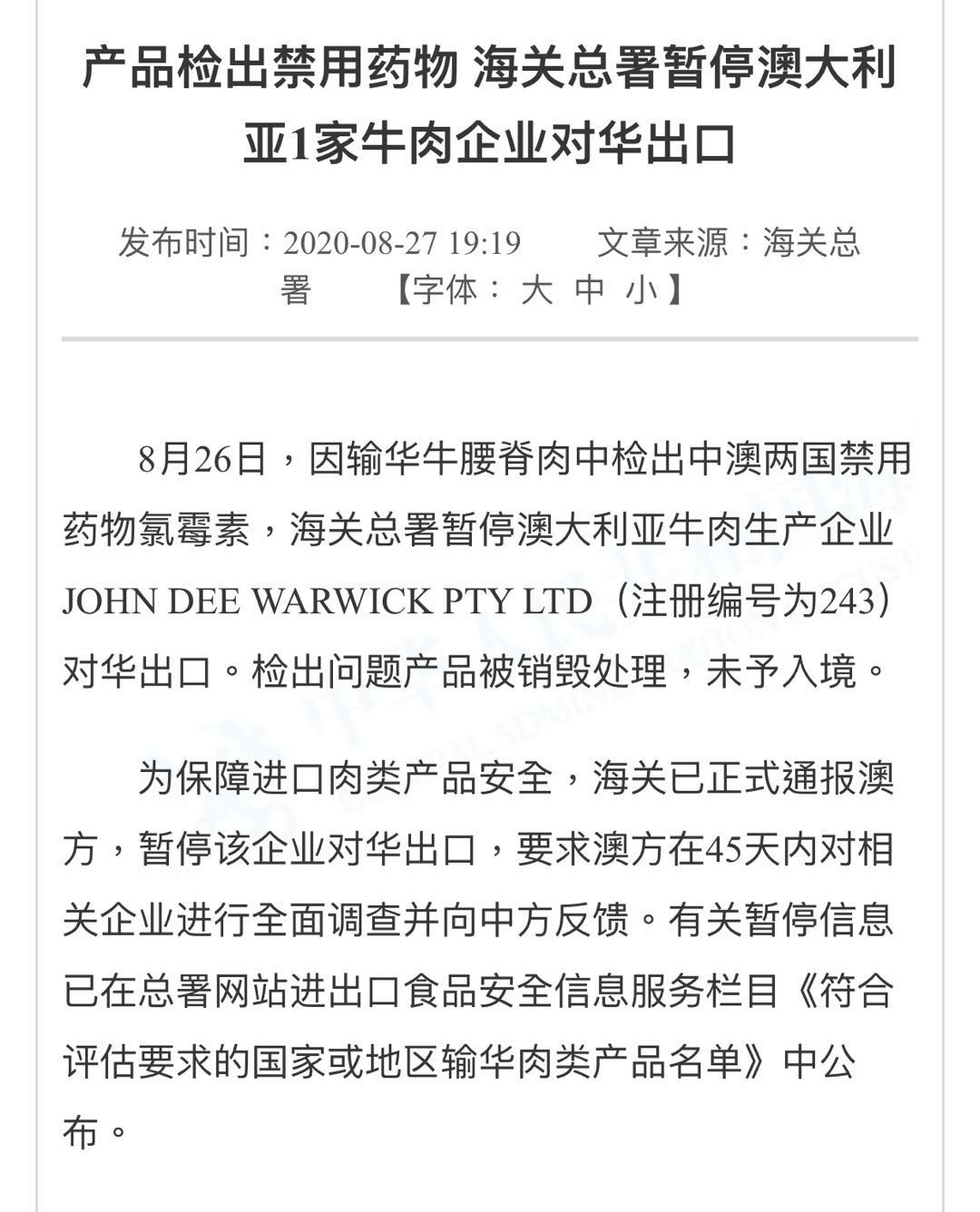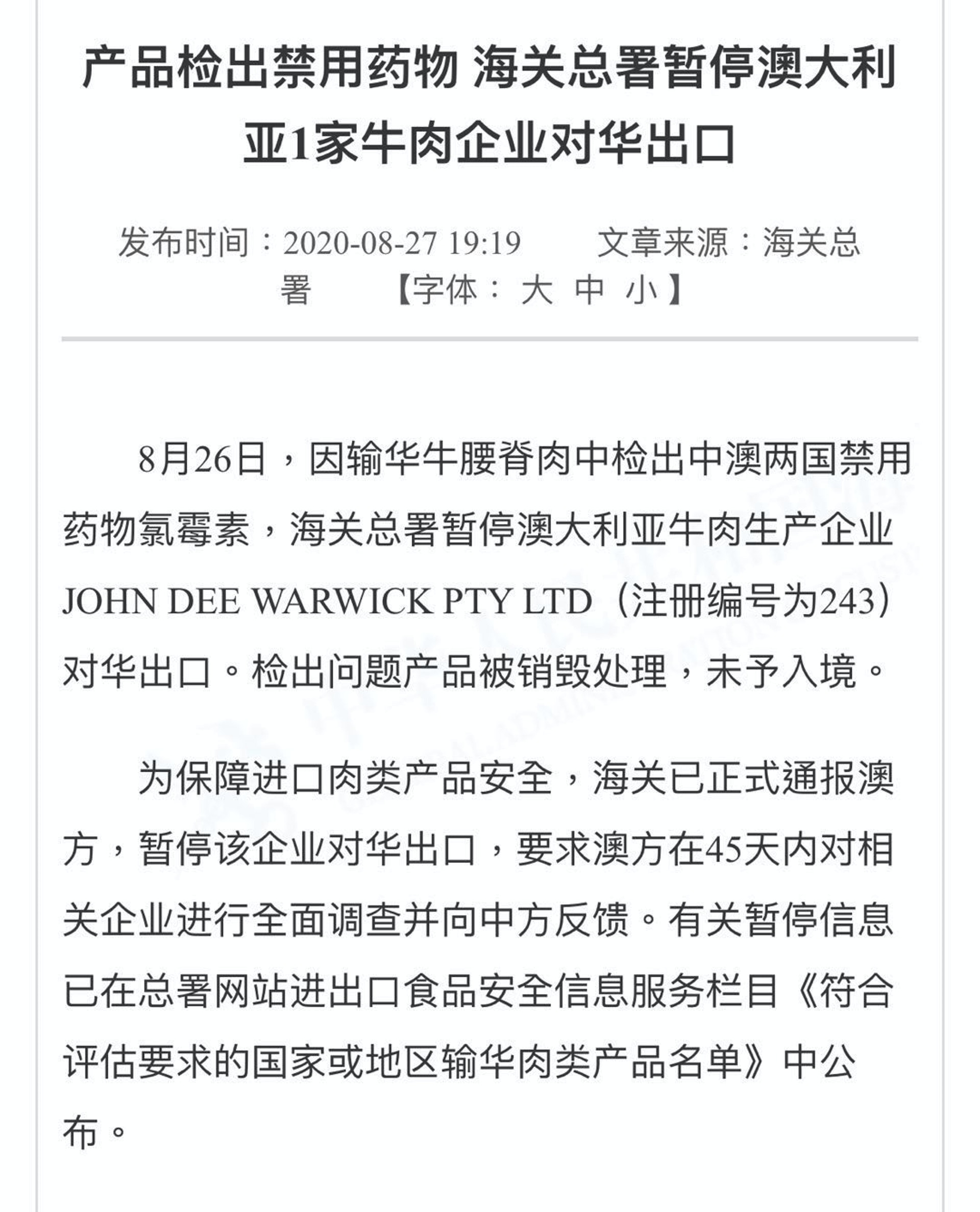 海關總署網站消息顯示,為保障進口肉類產品安全,海關已正式通報澳方,暫停該企業對華出口,要求澳方在45天內對相關企業進行全面調查並向中方反饋。