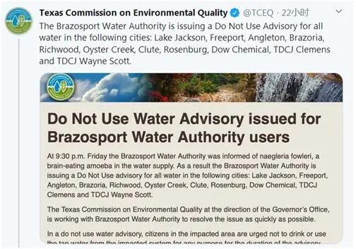 根據上述警告,得州環境質量委員會還向該州萊克傑克遜、自由港、安格爾頓、布拉多利亞、里奇伍德、奧伊斯特克里克、克勞特、羅森博格等超10餘個地區紛紛發出提醒,建議居民「不要用水」。