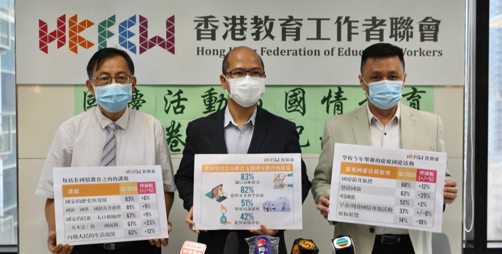 教聯會在10月初向全港學校發出調查問卷,了解學校在國慶節期間進行的活動,以及教師對國情教育的看法。調查發現,逾九成受訪教師指今年學校有舉行慶祝國慶活動,其中升旗禮丶懸掛國旗較去年上升一成至二成半。隨著香港國安法的實施,學校須開展國家安全教育,超八成受訪教師期望教育局制訂清晰國家安全教育指引,以及提供更多教學資源。教聯會促請政府带頭加強對教育界支援,推動學生學習相關概念,並盡快公布國安教育的詳細指引,包括教授内容及教學安排,讓學校和教師有所依循。