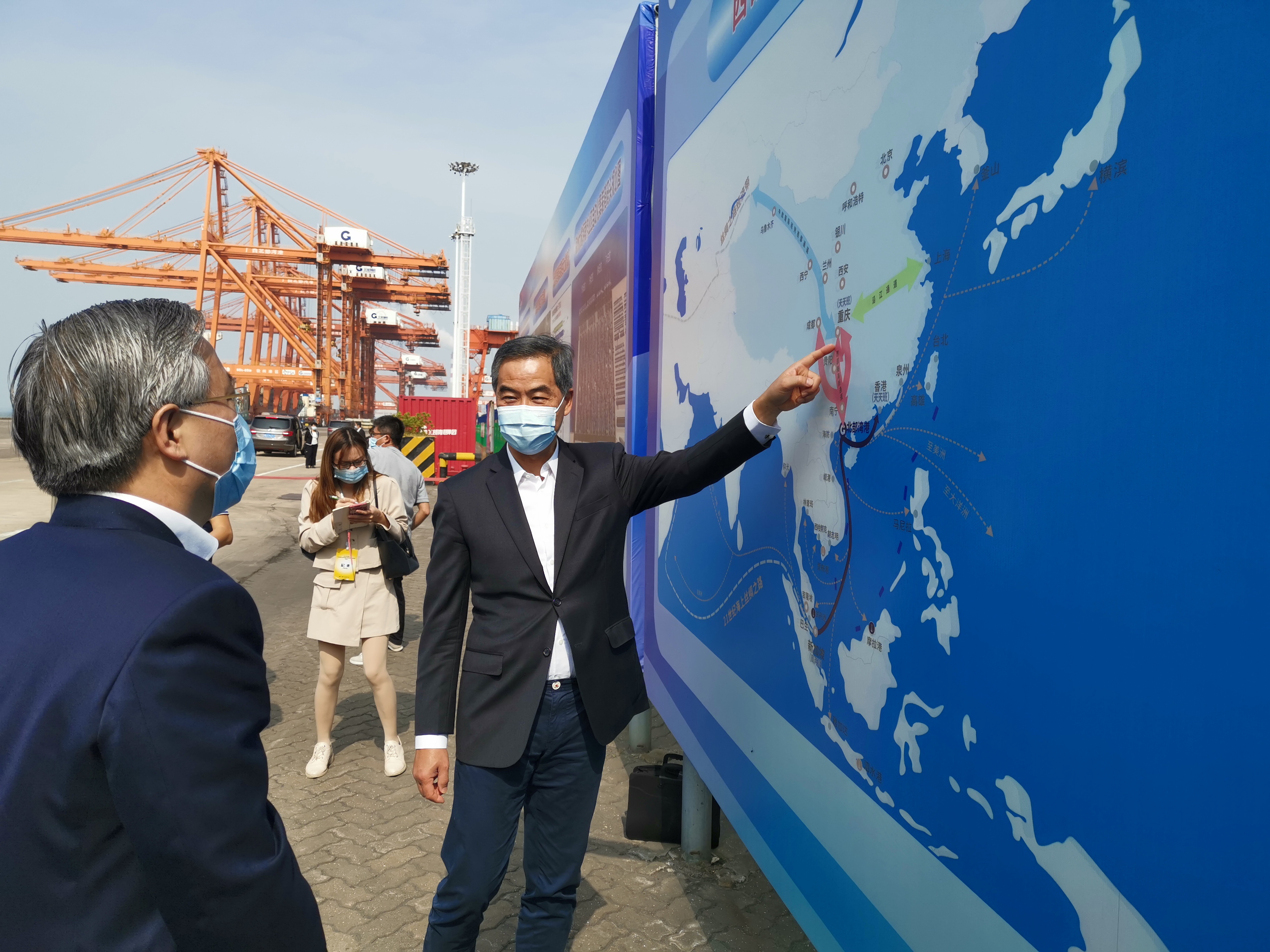 2日上午,全國政協副主席梁振英在廣西壯族自治區副主席周紅波的陪同下赴廣西欽州北部灣港考察。梁振英在欽州深入廣西自貿區欽州片區、西部陸海新通道海鐵聯運碼頭考察。在欽州海砂供香港機場三跑海砂裝運碼頭,梁振英關切地詢問當前採砂和運輸供香港的情況。