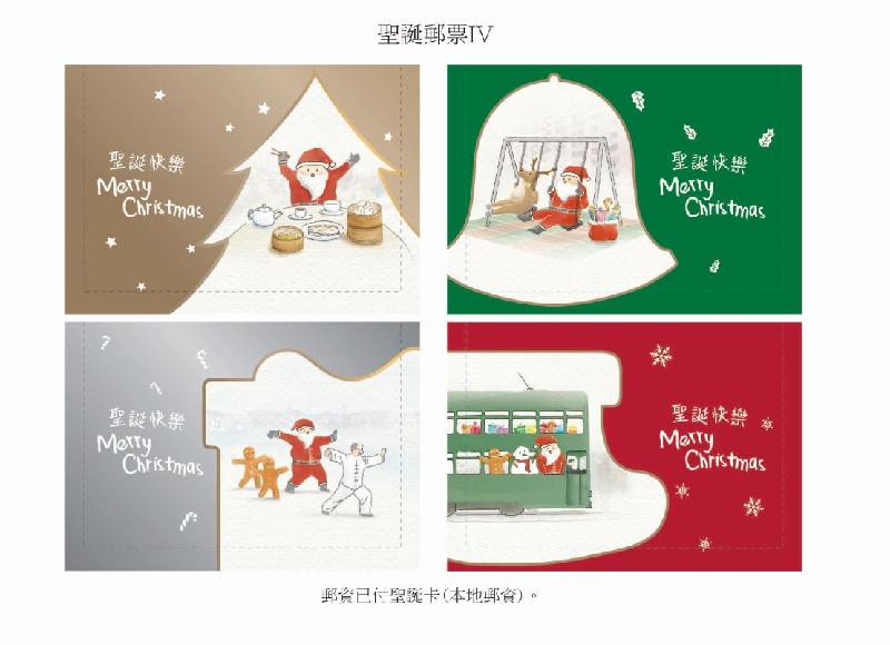 為慶祝聖誕佳節,香港各郵政局4日(星期五)將發行以「聖誕郵票IV」為題的特別郵票及相關集郵品,包括首日封、郵票、小全張、自動黏貼小全張、自動黏貼郵票小型張、套摺、郵資已付聖誕卡及已蓋銷首日封。