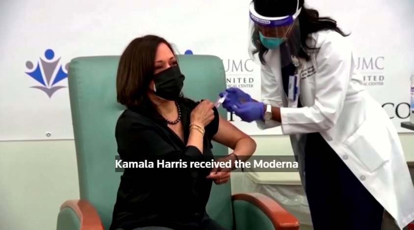 「我幾乎沒什麼感覺。」賀錦麗在左上臂施打了疫苗後笑着說。「我希望鼓勵人人都接種疫苗–相對來說這根本不痛…是安全的…這實在是在挽救生命。我信任科學家們。」