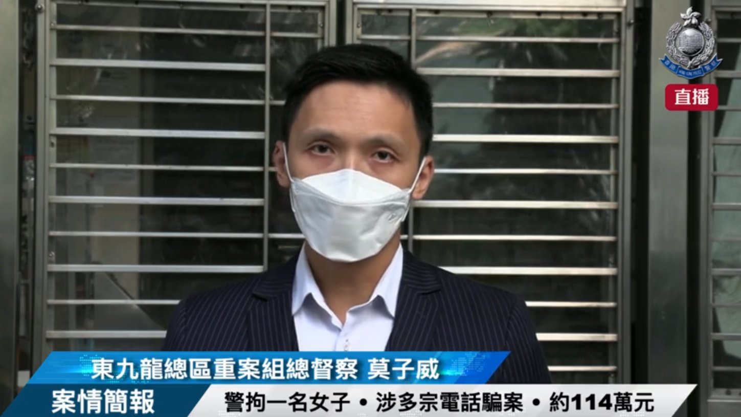 東九龍總區重案組總督察莫子威今日(30日)見傳媒時表示,涉案的已知受害人包括3男6女,他們年齡介乎19至80歲,每宗受騙個案金額介乎5000元至57萬元。而被捕女子本身亦是電騙受害者,莫子威形容被捕女子「中毒太深」,不知道自己被騙。