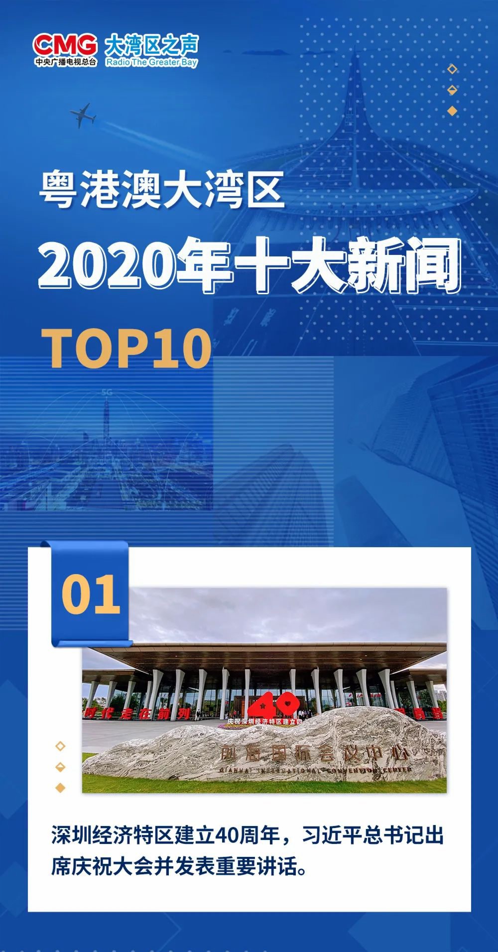 中央廣播電視總台大灣區之聲今日(29日)評出「2020年粵港澳大灣區十大新聞」。其中,「深圳經濟特區建立40周年,習近平總書記出席慶祝大會並發表重要講話」、「中共中央辦公廳、國務院辦公廳印發《深圳建設中國特色社會主義先行示範區綜合改革試點實施方案(2020-2025年)》」成為最受關注的兩大新聞。