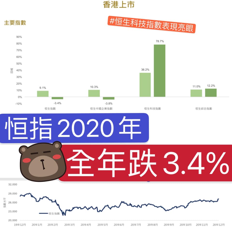 今日(31日)係本年度最後一個交易日,係時候「埋單」計下數。恒生指數最新公布2020年總結報告,指2020股市在全球疫情拖累下,唯獨與科技相關指數能跑出。