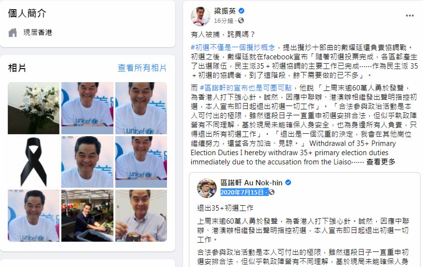 梁振英指出,區諾軒的表態也是「可圈可點」,他說 「上周末逾60萬人勇於發聲,為香港人打下強心針。誠然,因應中聯辦、港澳辦相繼發出聲明指控『初選』,本人宣布即日起退出『初選』一切工作」。「合法參與政治活動是本人可付出的極限,雖然這段日子一直重申『初選』安排合法,但似乎執政陣營有不同理解,基於現局未能確保人身安全,也為身邊所有人負責,只得退出所有『初選』工作」。