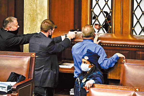 美國國會山莊遭受200多年來最嚴重的攻擊,參眾兩院聯席會議前日點算大選選舉人票期間,數以千計總統特朗普的支持者,聽從特朗普的唆擺煽動,包圍並入侵國會山莊,大肆破壞及搗亂,並企圖衝擊仍有大批議員的眾議院議事廳,警員一度拔槍,副總統彭斯及兩院領袖更需緊急撤離。事件導致最少4人死亡,52人被捕,參眾兩院其後繼續開會,最終確認拜登當選下屆美國總統。美國朝野各界則一致譴責特朗普煽動暴亂,企圖以武力政變奪權,強調其圖謀不會得逞。