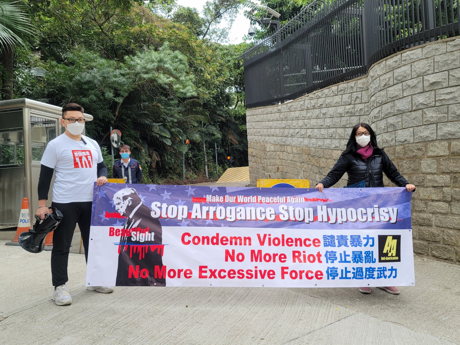 团体“美帝霸权调查组”联同“爱国护港101”代表下午2时许到美国驻港总领事馆外作出呼吁,并拉起写有“谴责暴力 停止暴乱 停止过度武力”的中英文横额。