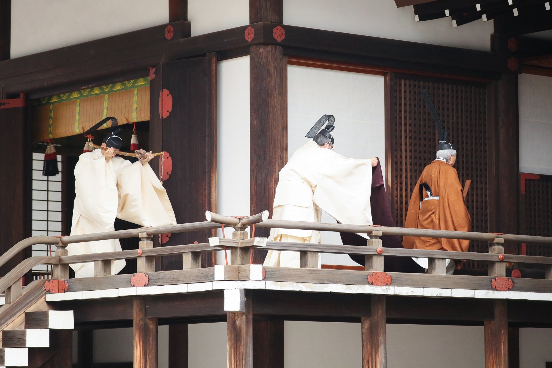 明仁之後前往祭祀皇室祖先的皇靈殿,隨後再到祭祀日本眾神的神殿出席儀式,同樣在行禮後宣讀「御告文」。周三(5月1日)即將即位日皇的皇太子德仁同樣身穿相關服裝,在明仁行禮完後同樣行禮。