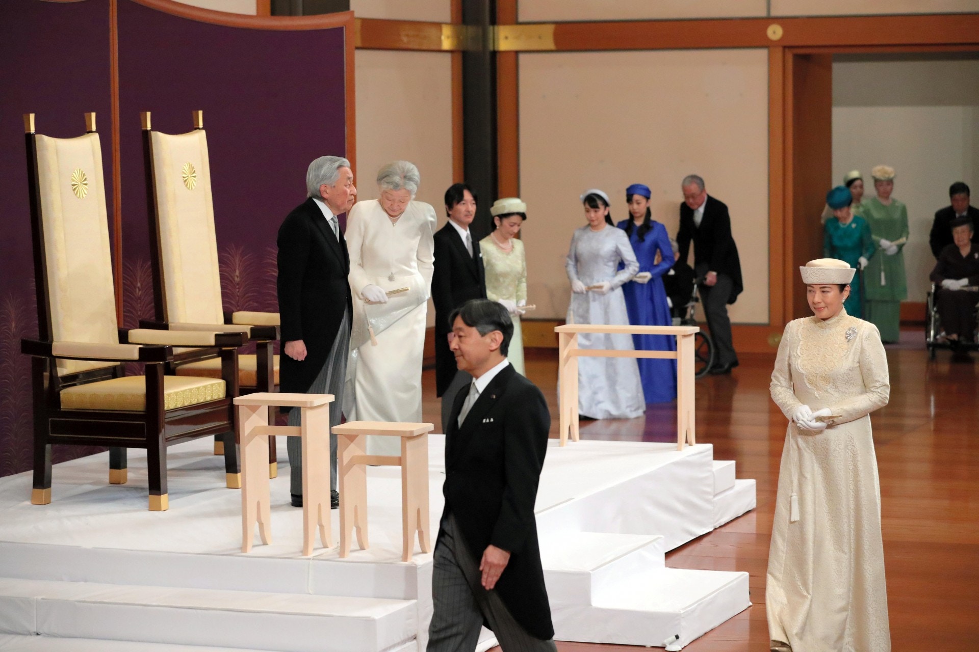 日本《讀賣新聞》報道,美智子因為舊疾、雅子為準備傍晚的退位禮正殿之儀,2人都未出席上午儀式。文仁親王夫婦和長女真子、次女佳子等皇族人士都前往行禮。