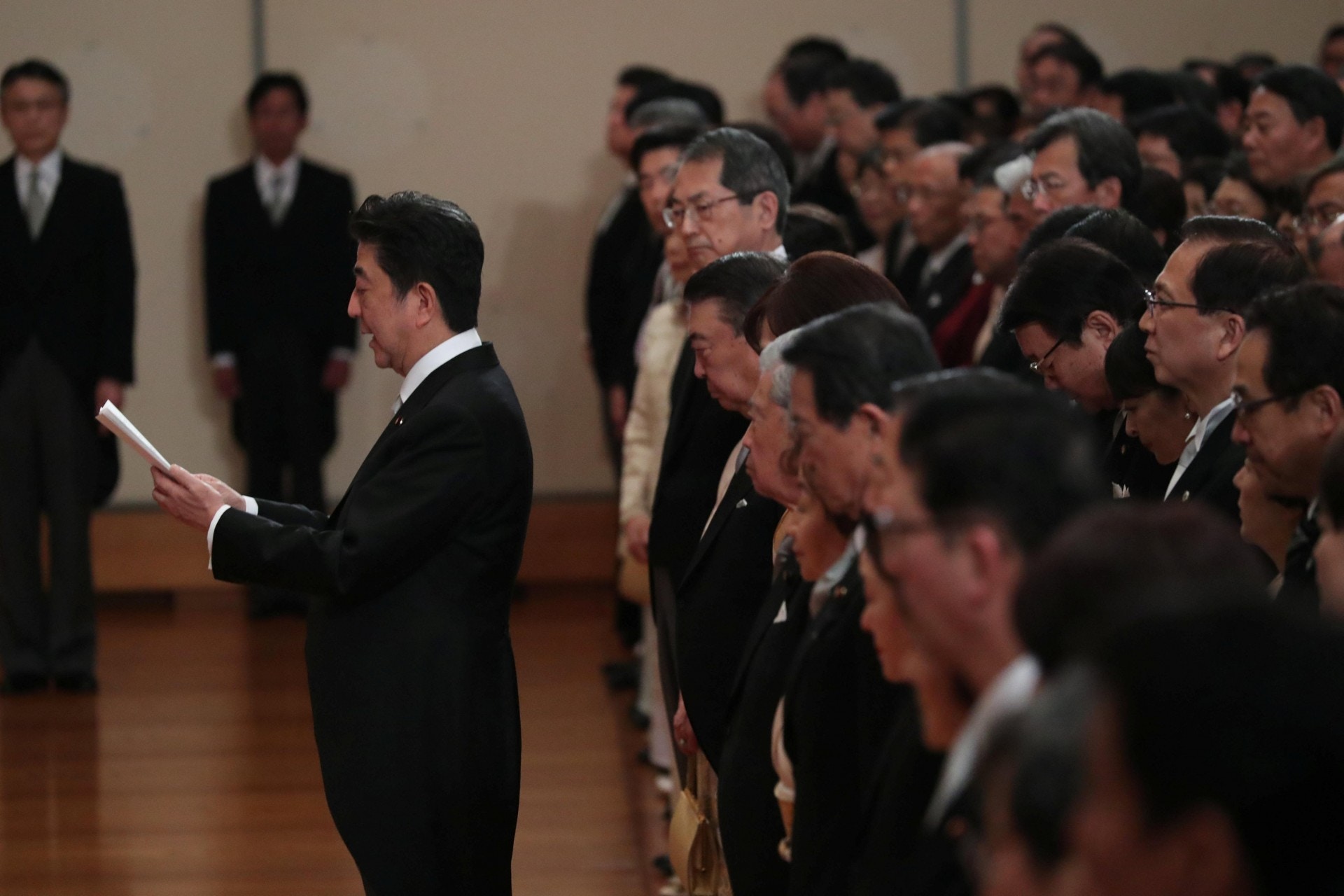 接着,明仁接過預先準備的宣讀紙,面向安倍與所有出席的人們,最後一次以日皇身分向民眾致詞。