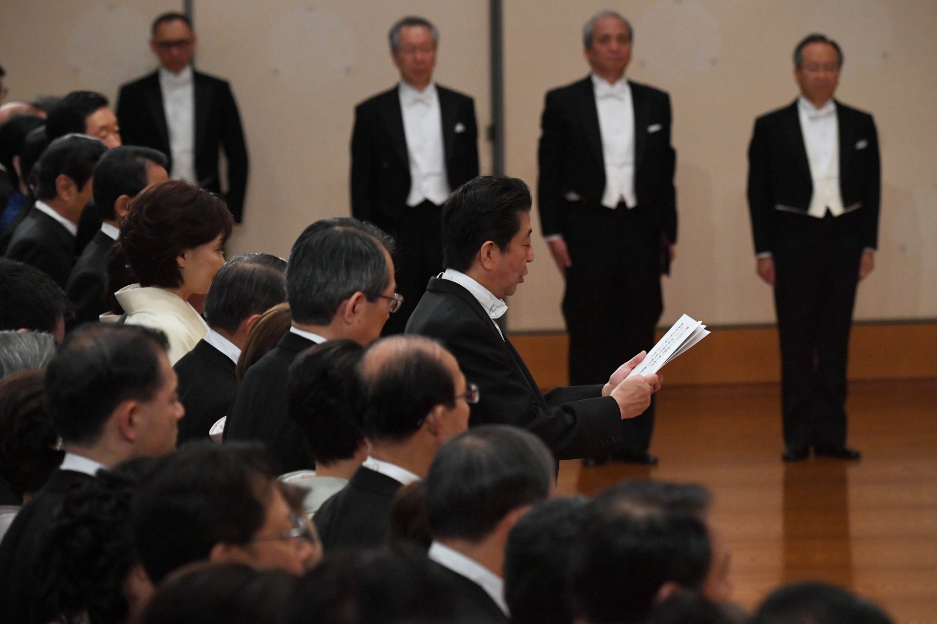 在全體鞠躬後,安倍作為國民代表向天皇報告,祝賀新天皇即位。安倍同表示政府將崇敬着天皇,並「在這動盪的國際情勢之中,創造充滿希望,人民彼此相愛,自豪的日本新時代。」