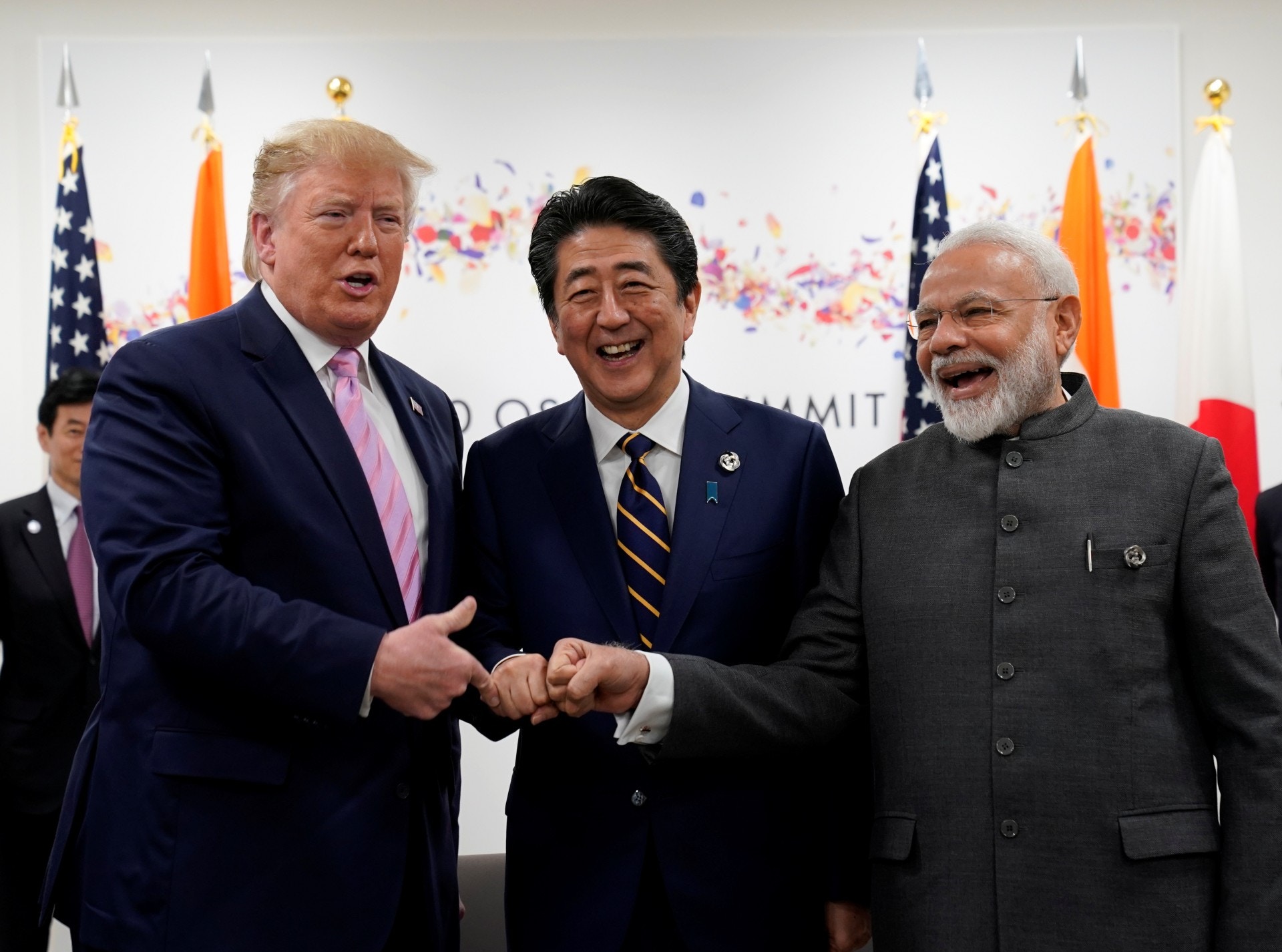 G20峰會:6月28日早上會議正式開始前,特朗普、安倍晉三及習近平並排而坐。這個座位安排引起外界好奇。(美聯社)
