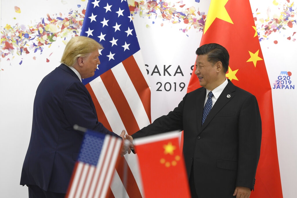 G20峰會:美國總統特朗普與中國國家主席習近平6月29日在大阪國際會展中心會面。特朗普在習近平發言後發表講話,稱盼與中方能談出豐碩的成果。(美聯社)
