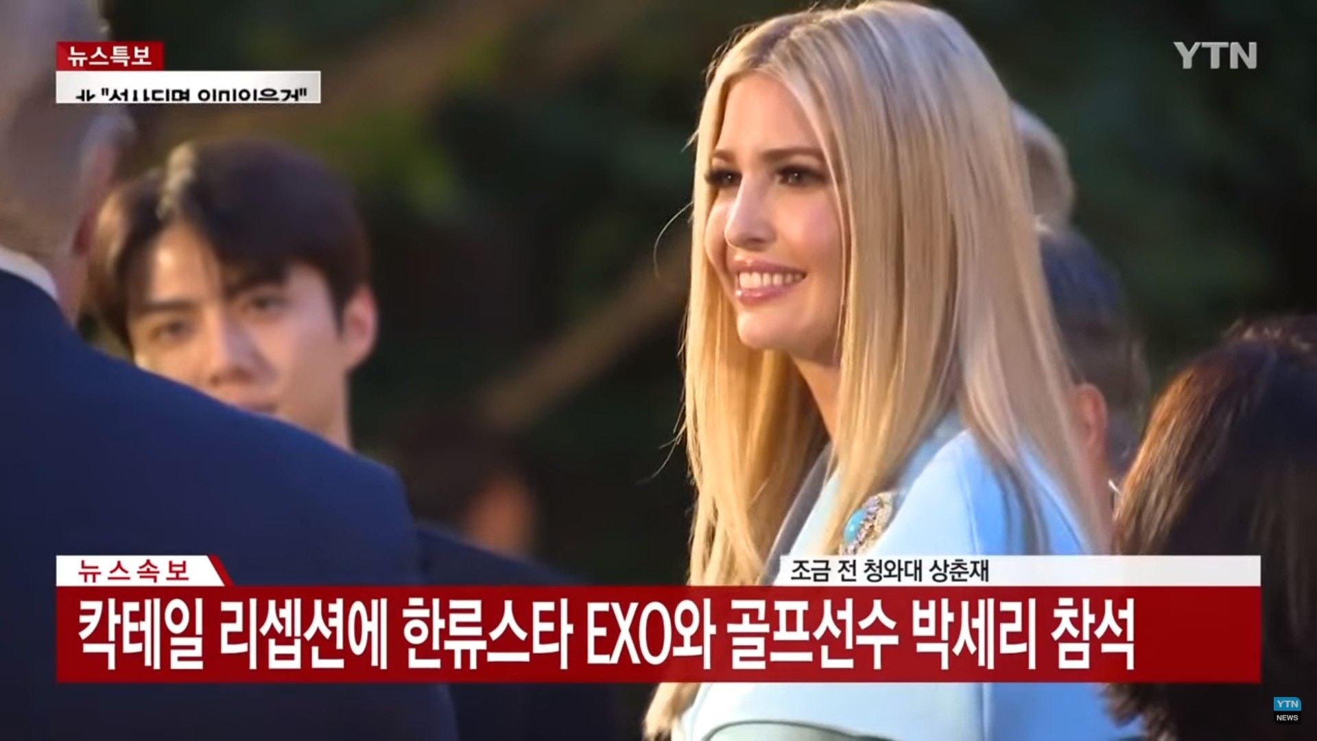 伊万卡继去年平昌冬季奥运会后,第二次与EXO见面,可是她仍然非常高兴,更请美国驻韩大使Harry Harris一同自拍,与偶像合影留念。事后Harry Harris把照片上传到Twitter上,EXO和伊万卡都有转发照片,表示期待下一次的见面。而特朗普亦有与EXO及朴世莉逐一握手,双方握手后连同文在寅亦寒暄了一段短时间。从韩国传媒的影片可见,虽未知两人交谈的内容,可是从表情仍可得知双方都似乎十分享受,被形容为外交上难得的场面之一。