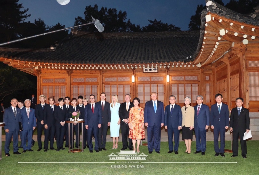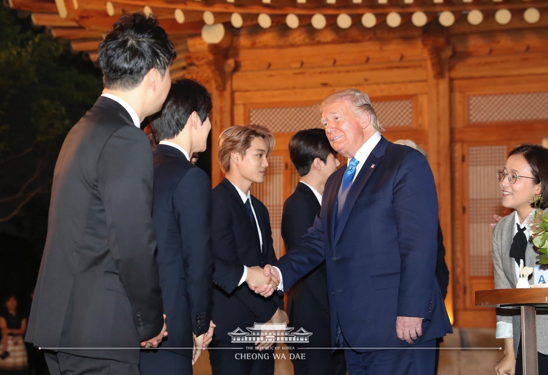 昨天(29日)特朗普一行人出发到首尔后,与文在寅夫妇于青瓦台共进晚餐,而EXO和高尔夫球手朴世莉也获邀出席。据闻文在寅知道特朗普女儿伊万卡是EXO的粉丝,因此特别安排这场惊喜。伊万卡见到偶像现身时,表示得非常开心,更从队长Suho手中接下签名专辑。而一旁的特朗普则一直点头,似乎也非常满意这场惊喜。