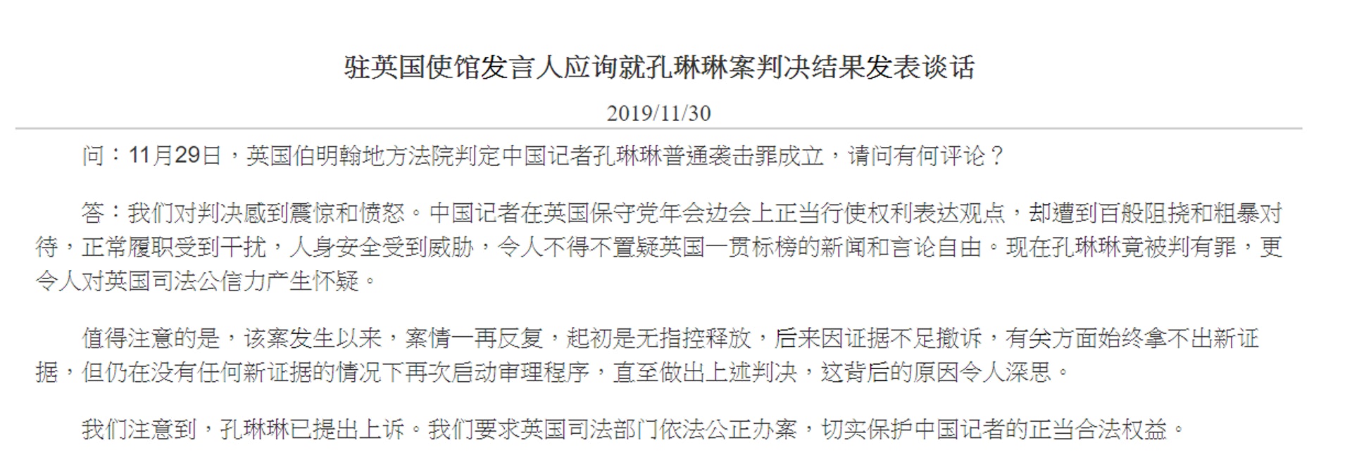 聲明還指,案情一再反復,起初是無指控釋放,後來並因證據不足撤銷指訴,現時又於沒有新證據下再次審理,作出有關裁決,令人質疑英方背後原因。大使館要求英國司法部門依法公正辦案,切實保護中國記者的正當合法權益。