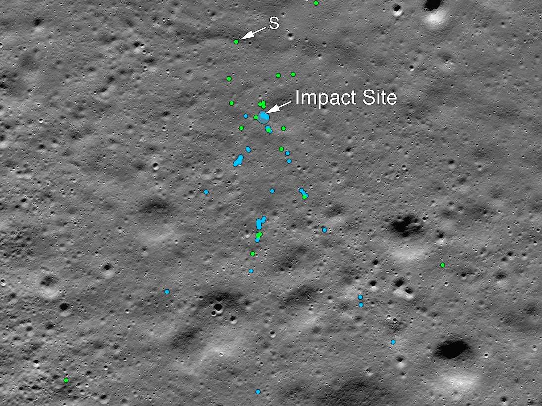 NASA通過圖像對比確定了着陸器撞擊時留下的痕迹和周圍碎片,碎片區域位於撞擊地點西北方向466公里處。圖像顯示出深色的條紋、碎片的小點和更亮的撞擊暈。