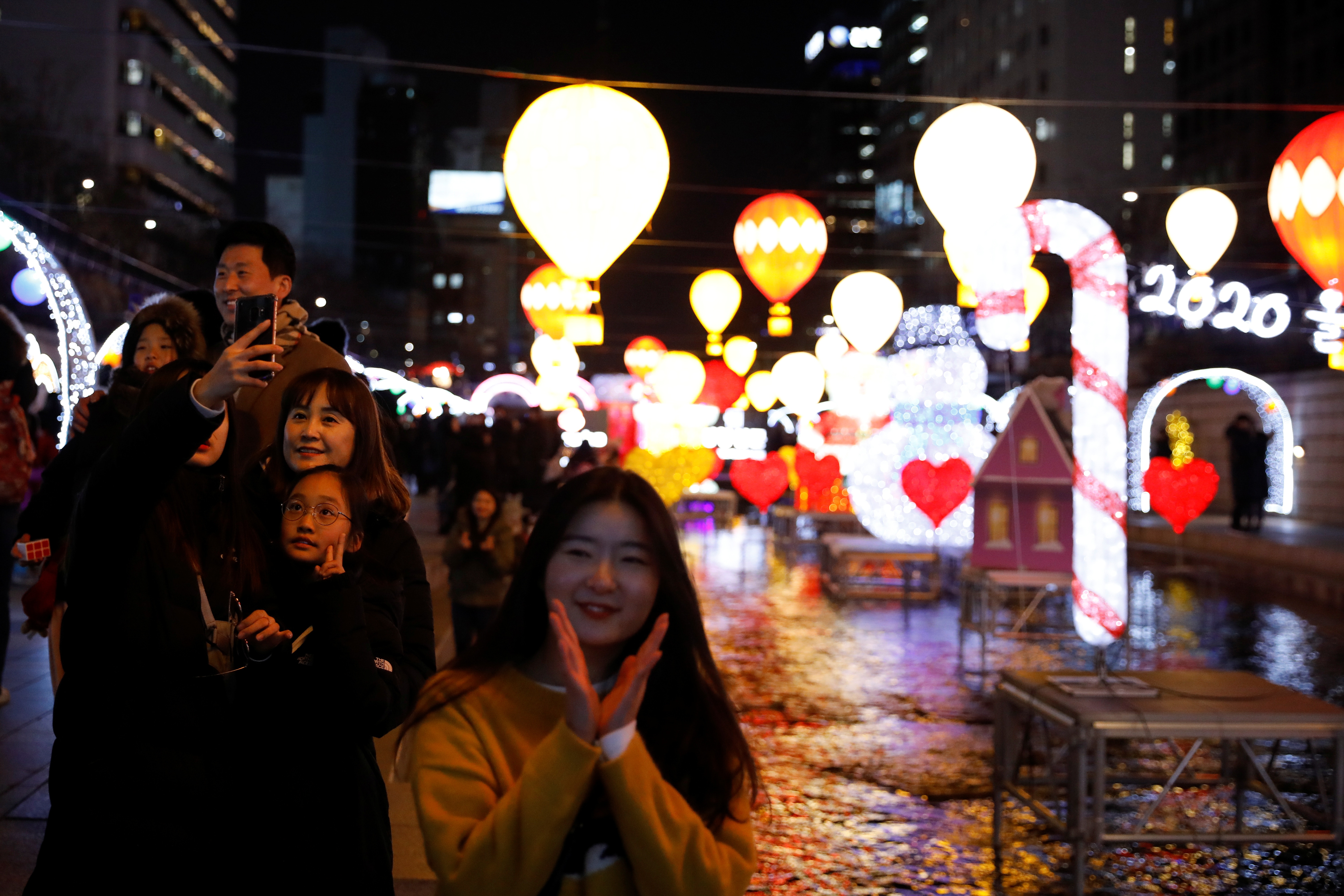 在韓國首爾人群齊集普信閣鐘樓,伴隨12時到來敲響鐘聲,在另一邊廂的樂天大樓亦點燃煙花慶祝。