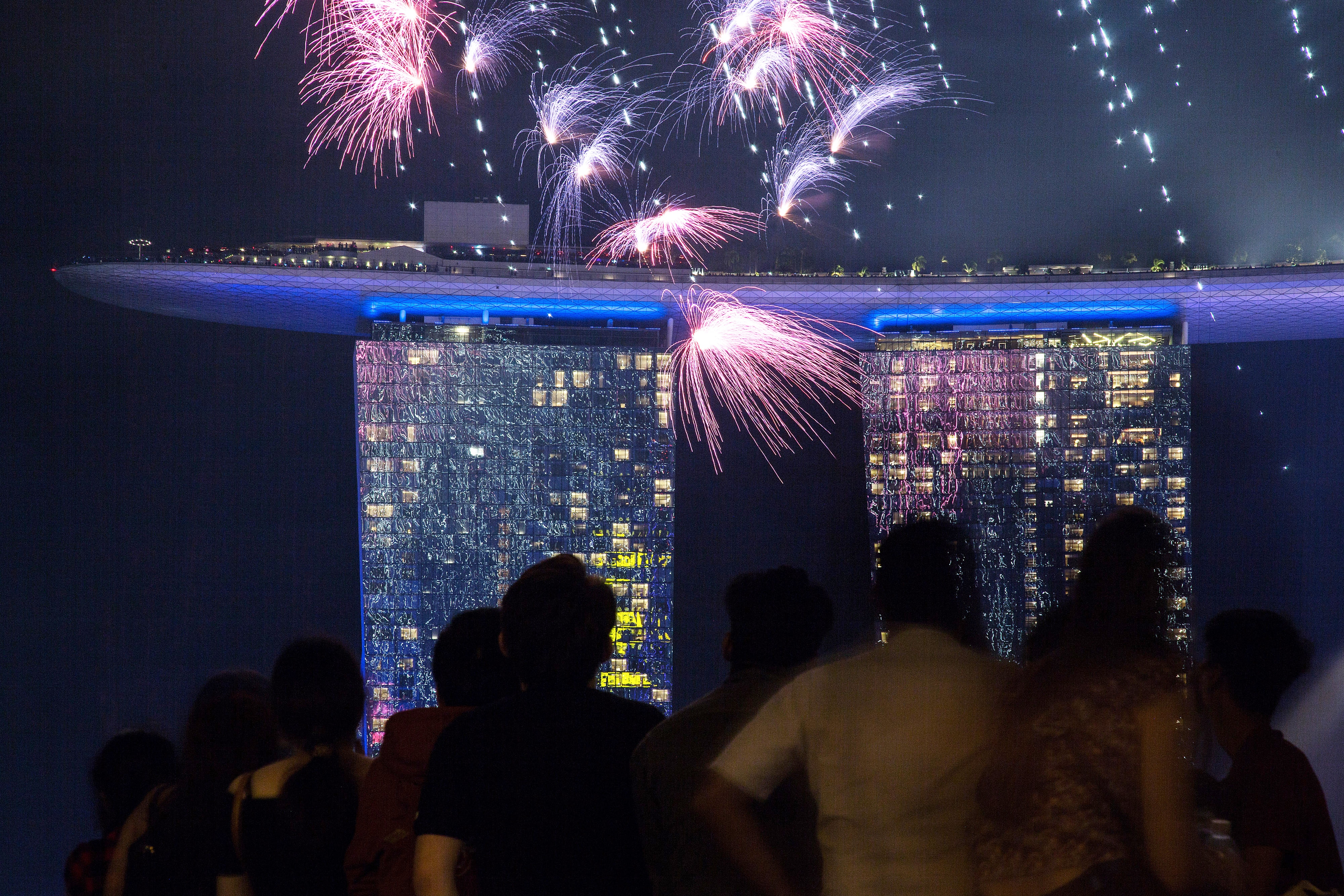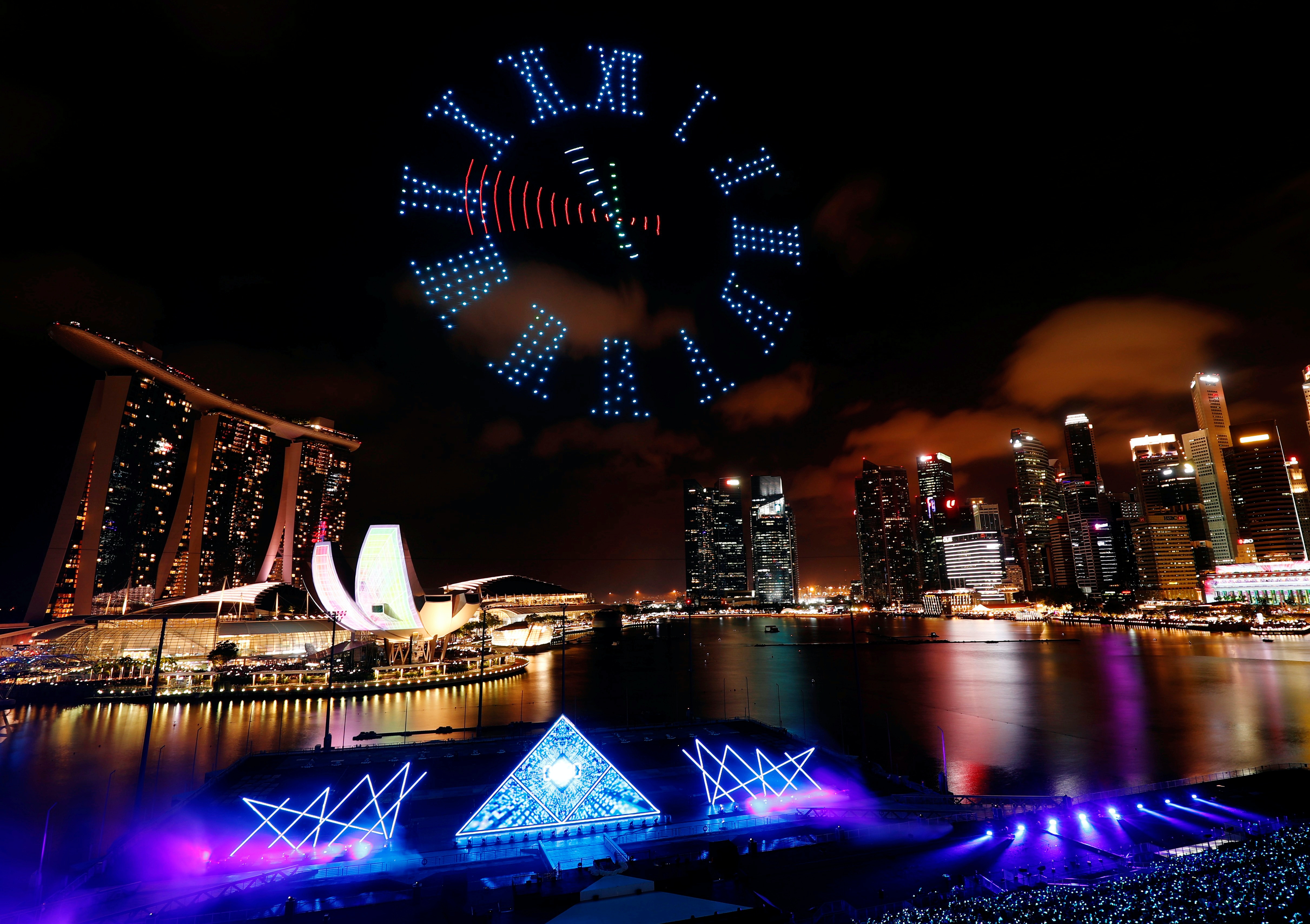 在新加坡,當局特別安排了500架無人機,在濱海灣上空列隊砌出魚尾獅、大鳥等各式各樣圖案,最後更砌出一個正在倒數的鐘,伴隨踏入12時煙花升空,令人目不暇給。