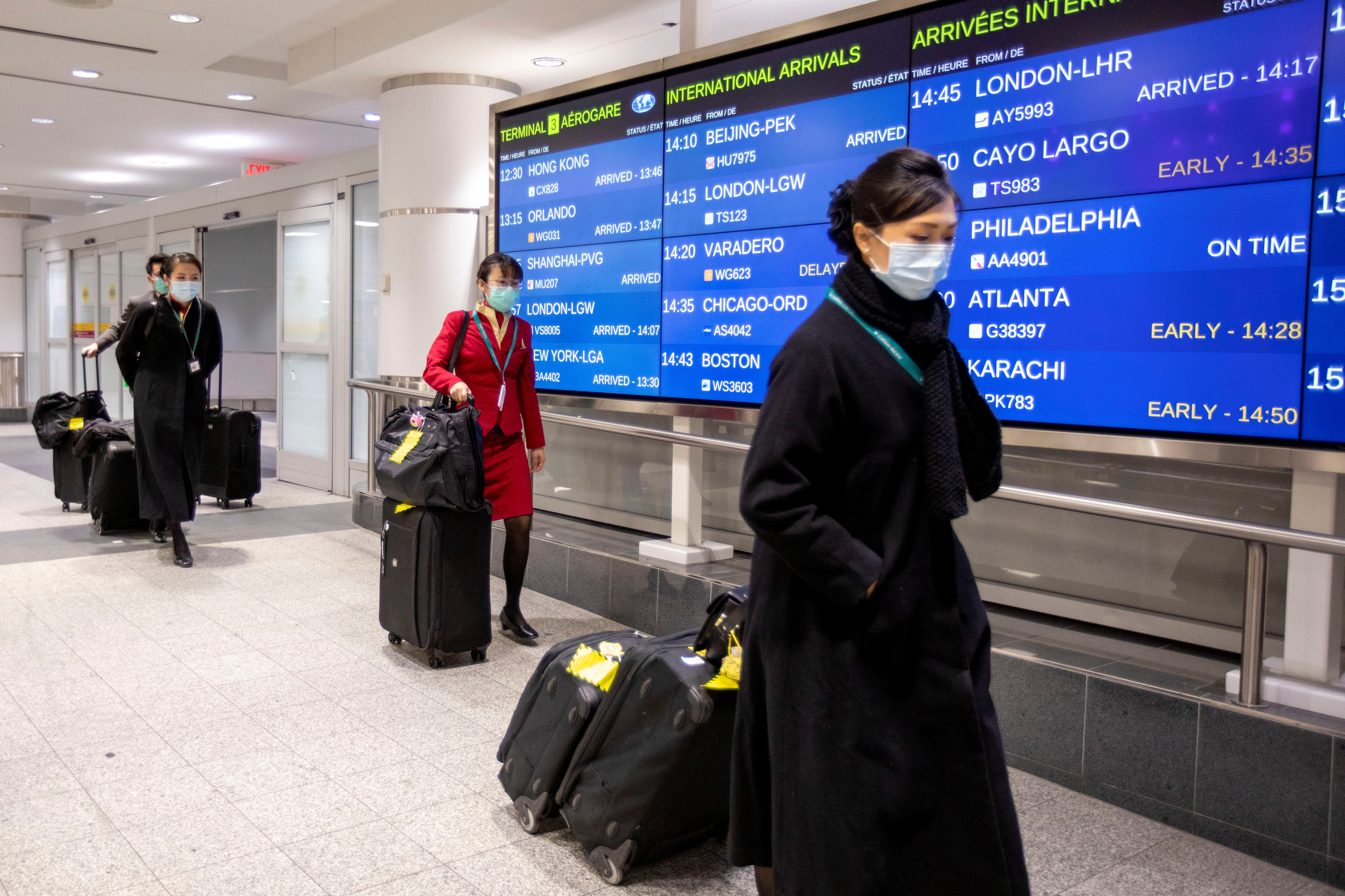 加拿大25日錄得該國第一宗「推定」的武漢肺炎病例。圖為1月25日多倫多皮爾遜國際機場內的情況,抵埗旅客及機組人員都有配戴口罩。(AP)