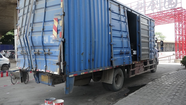 消防到場利用板車裝沙作緩衝,將洩漏的罐體逐一推下車。經過近兩個小時的處置,現場險情被成功排除,防止了化學品流入下水道造成污染。