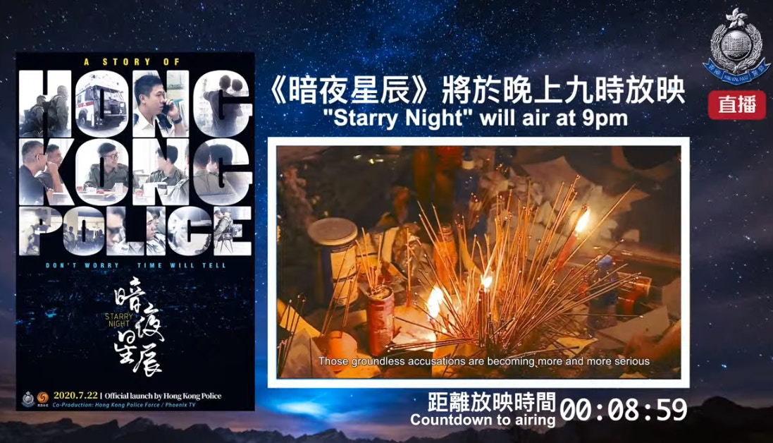 香港警務處與鳳凰衛視聯合製作的紀錄片《暗夜星辰》昨晚(22日)9時首播,前警察公共關係科總警司謝振中、「光頭警長」劉澤基及其妻子、參與「踏浪者」行動警員等參與拍攝,紀錄片主要集中警員剖白的片段,以及一些示威者使用暴力的片段。
