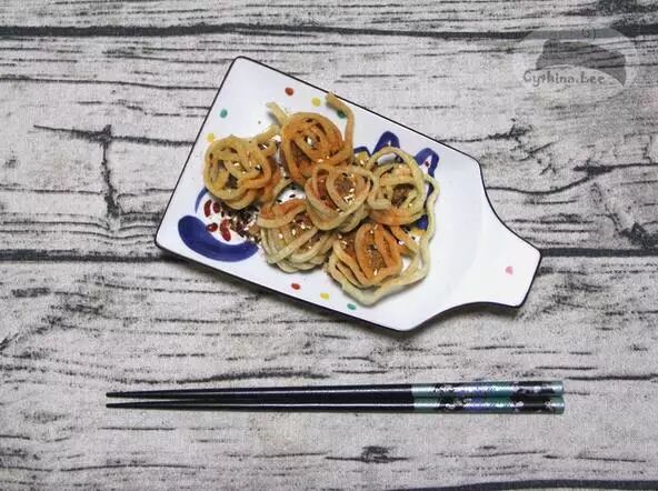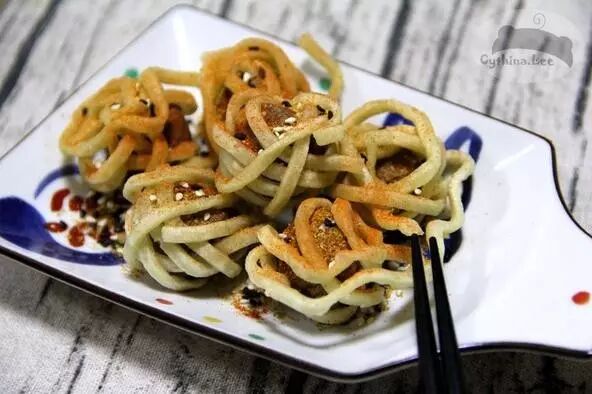 4、將面條裹在丸子外面用四成熱的油炸至定型後撈出,將油溫升至七成再次複炸即可盛出(這里選擇炸醬面因為其面條比較粗並且表面澱粉較多,比較容易定型,其它種類的泡面可以適當加入澱粉或雞蛋增加粘度)。