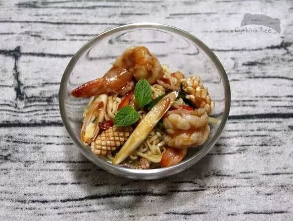通常泰式海鮮沙拉里面使用的主料是米粉,用泡面代替完全無違和感,還多了一些勁道的口感,作為酸辣爽口的下飯小菜再合適不過了~