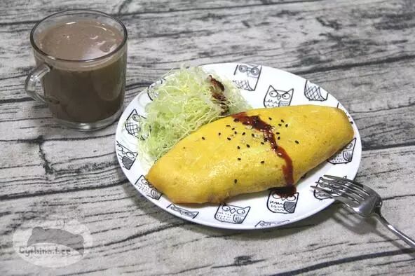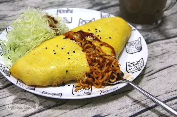 之前買的某超辣火雞面,對我來說有點太辣了,於是被束之高閣。最終被做成了蛋包面,松軟蛋皮中和了辣度後適口多了~