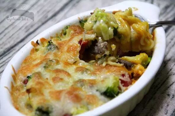 泡到半熟的泡面在焗烤的過程中逐漸滲透了白醬的奶香味,以及表層芝士的濃郁香味,分分鐘消滅一大盤!