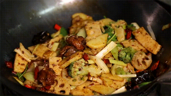 2、油鍋內再下入藕片、芹菜、魚豆腐、洋蔥、西蘭花、 土豆片、木耳,炸熟。撈出,用水淋一下,過掉多余的油。