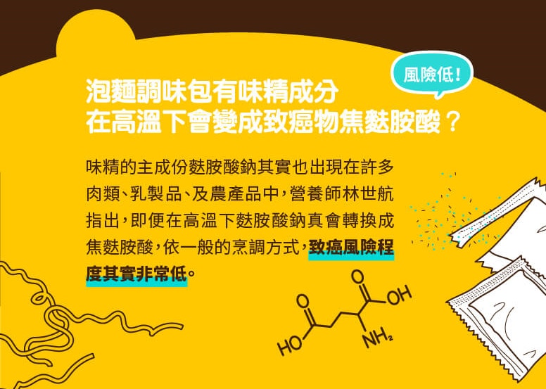 疑雲一:泡麵調味包有味精,在高溫下會變成致癌物?