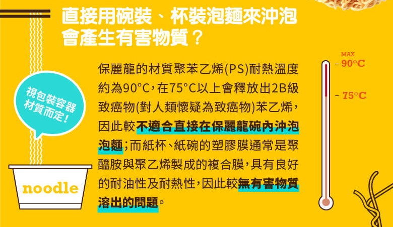事實上,保麗龍的材質聚苯乙烯(PS)耐熱溫度約為90°C,使用75°C以上的水沖泡,的確會釋放出2B級致癌物(對人類懷疑為致癌物)苯乙烯,而泡麵沖泡又多是使用沸水,因此較不適合直接在保麗龍碗內沖泡泡麵。(VCG)