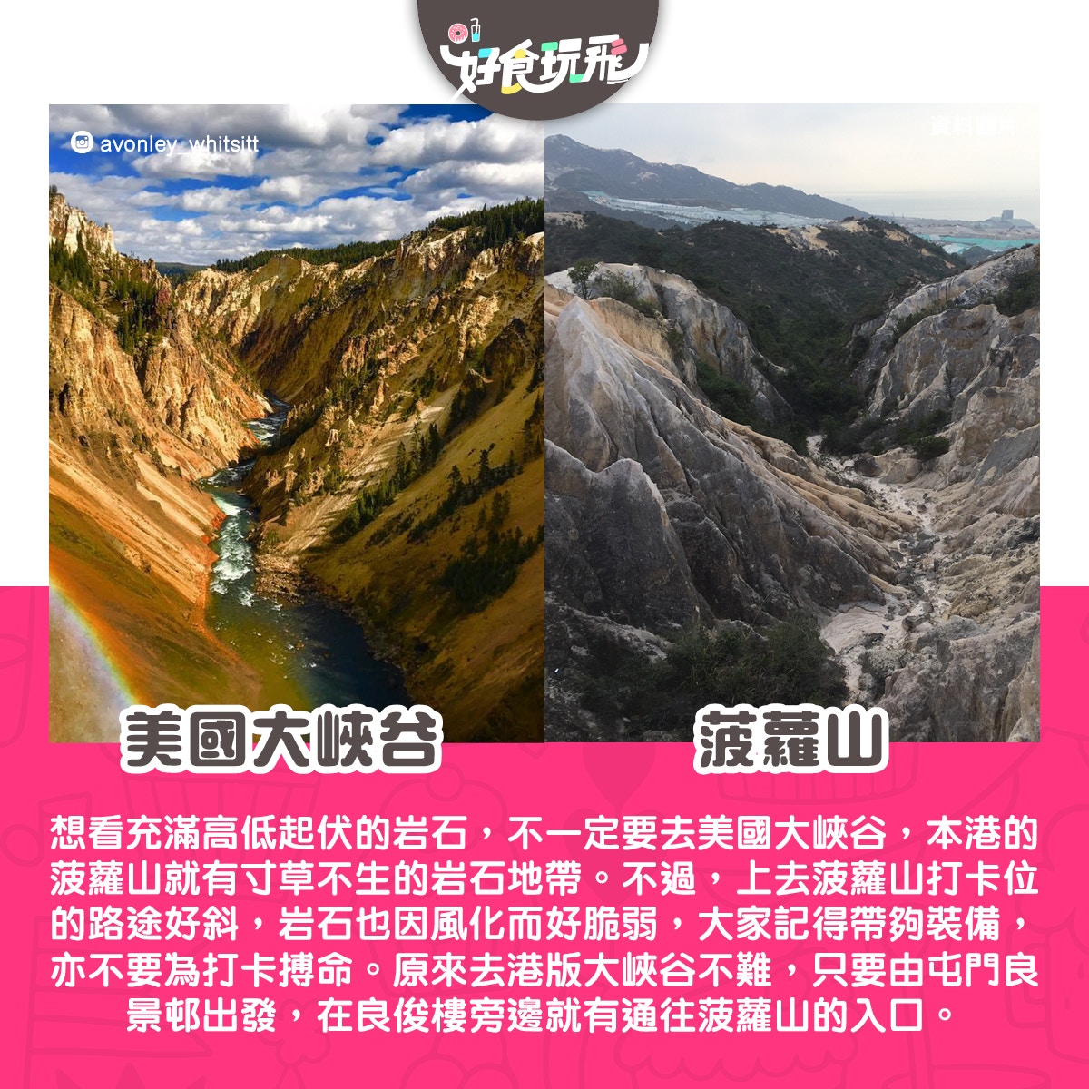睇靚景不一定要去外地,本港都有不同風景值得我們去發掘和留意,分分鐘找到外地有名景點的影子。講到港人最熟悉的,不得不提「港版大峽谷」的菠蘿山和「東方威尼斯」的大澳,但本港的美景怎會這麼少?