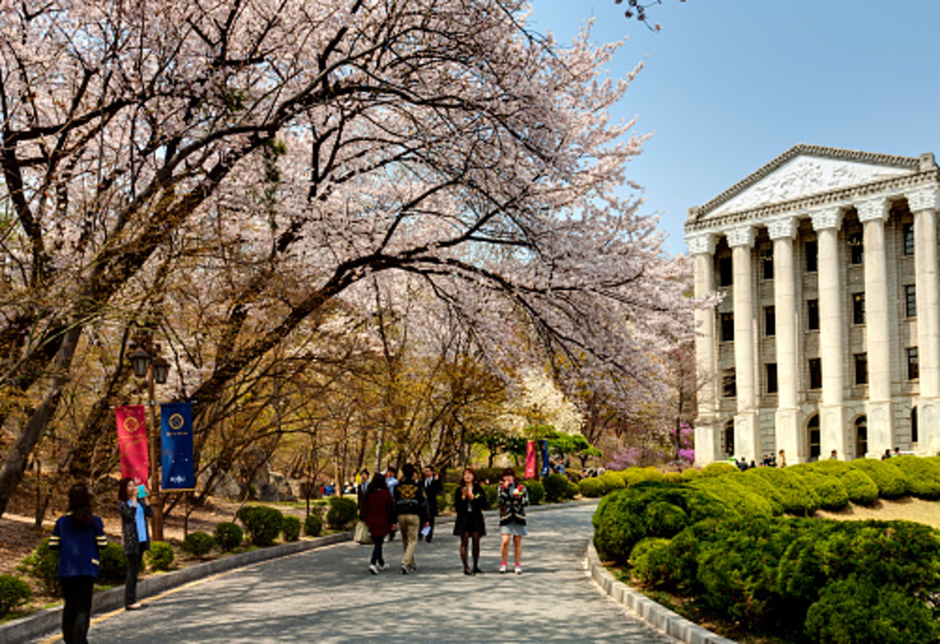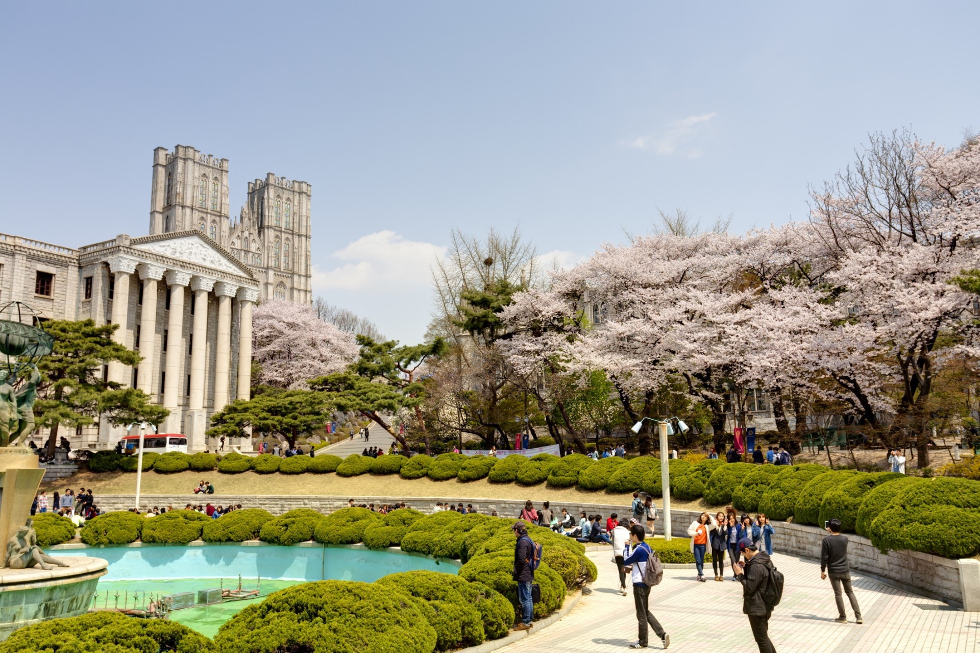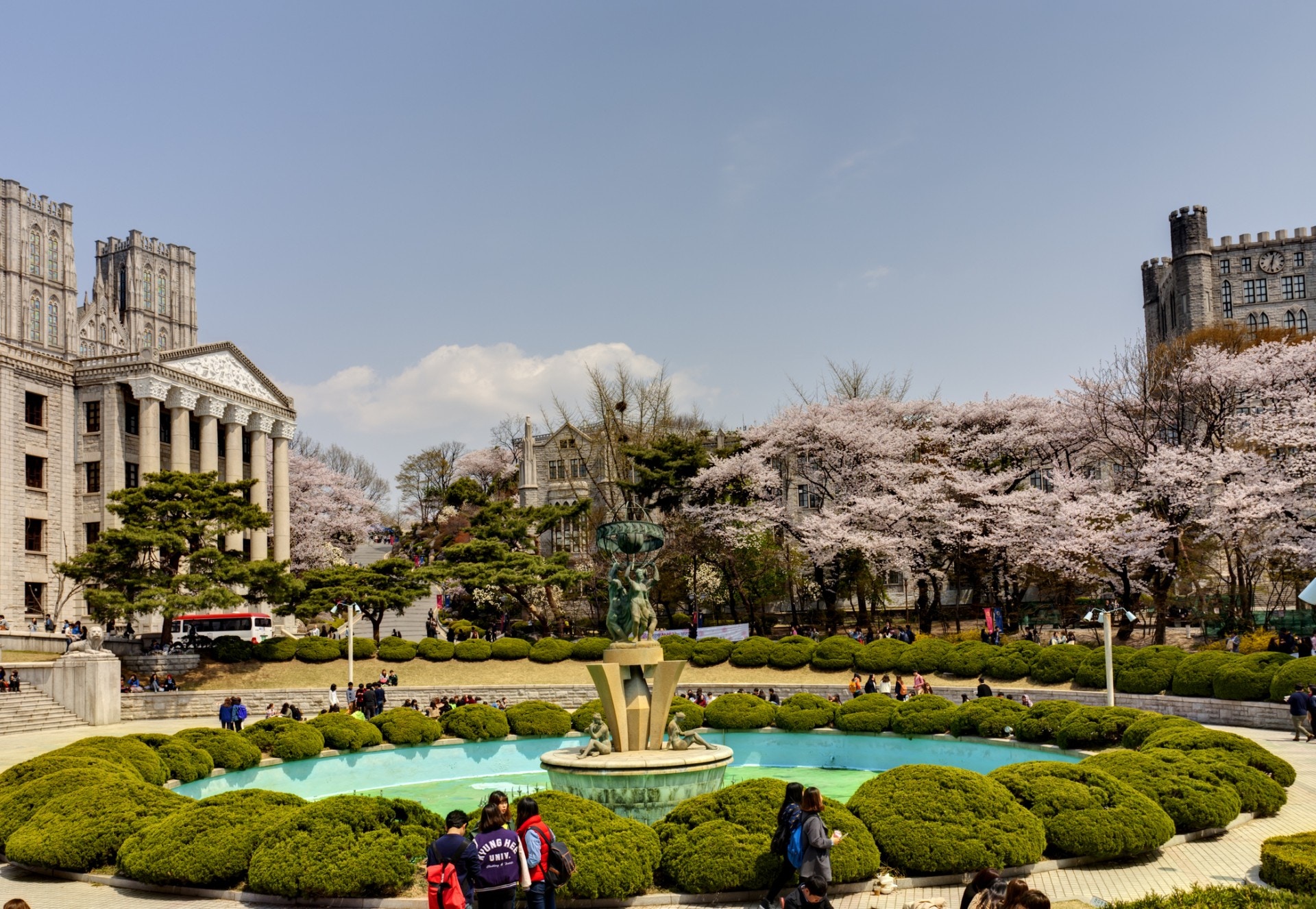 基本上只要到了春天,韓國各大校園都是不錯的賞櫻景點,但其中又以慶熙大學最為著名。以歐式建築著稱的慶熙大學,平常已吸引不少遊客前往。不過當櫻花一開時,卻又是另一盛況,除了觀光客之外,附近的中學也常會集體前往校外教學。