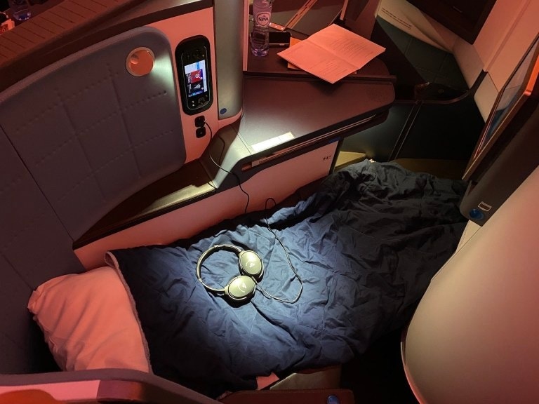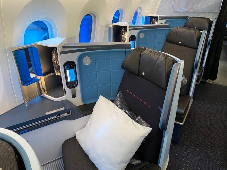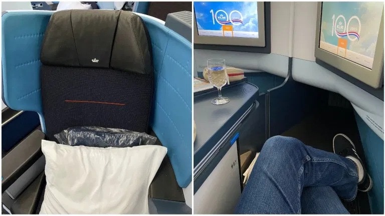 在貴賓室內稍作停留,吃了一些點心後,就前往登機門了,這次所搭乘的航班,原本以為有機會搭乘到荷蘭皇家航空全新接收的Boeing 787-10機型的商務艙,但是在起飛前兩個月,航班機型臨時被更改成Boeing 787-9,雖然有點小失望,但其實搭乘過後,覺得荷蘭皇家航空的Boeing 787-9商務艙也是挺不錯的。這個機型的商務艙採用1-2-1配置,整個商務艙有三十個座位,座位的設計是採用目前各大航空公司最喜歡使用的反魚骨式設計,座椅都可以全平躺,整體設計十分的有質感,尤其是我蠻喜歡藍色的配色。