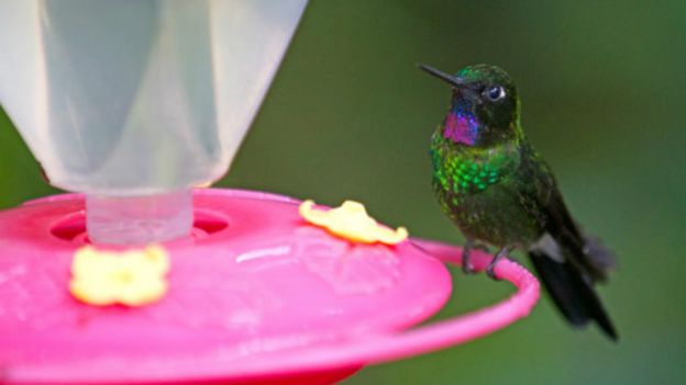 蜂鳥飛來飛去,就像森林中的奇妙仙子一樣。因而,觀賞過程幾乎令人眼花繚亂。通過每分鐘振翅高達80次,且每分鐘心跳數百下,它們不僅可以向上、向下、向前飛舞,甚至還可以倒掛和倒退。有時候,這看上去就像在做遊戲一樣:時而翱翔在遠處,時而飛到你耳畔稍停片刻,然後突然消失了,就像滋潤著雲霧森林和邊遠小鎮的水一樣蒸發了。它們是一道道彩虹色的閃光,它們振翅速度如此之快,以至於用肉眼幾乎看不到,它們的嘴喙則細如針。